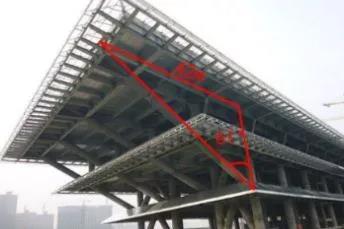 (2)“大傾角鋼柱吊裝模擬”是利用專(zhuān)業(yè)的BIM設(shè)計(jì)軟件為項(xiàng)目創(chuàng)建精確的數(shù)字化模型,在直觀(guān)的3D環(huán)境下分析、優(yōu)化,并為異型構(gòu)件創(chuàng)建施工定位圖,根據(jù)模型進(jìn)行工程量統(tǒng)計(jì)。由于鋼柱傾斜角最大約61°,分三層多步向外傾斜,可利用MIDAS軟件對(duì)結(jié)構(gòu)進(jìn)行施工階段模擬分析,確保了施工方案安全可行,見(jiàn)圖7(b)。