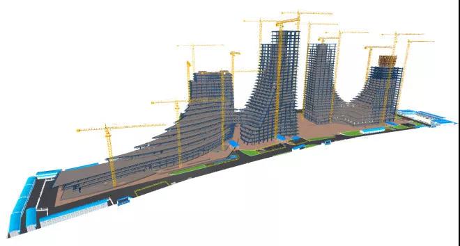 (3)“17臺(tái)塔吊交叉作業(yè)模擬”主要是采用BIM技術(shù)有效組織塔吊運(yùn)力,避免群塔碰撞,起到了良好效果,見(jiàn)圖7(c)。