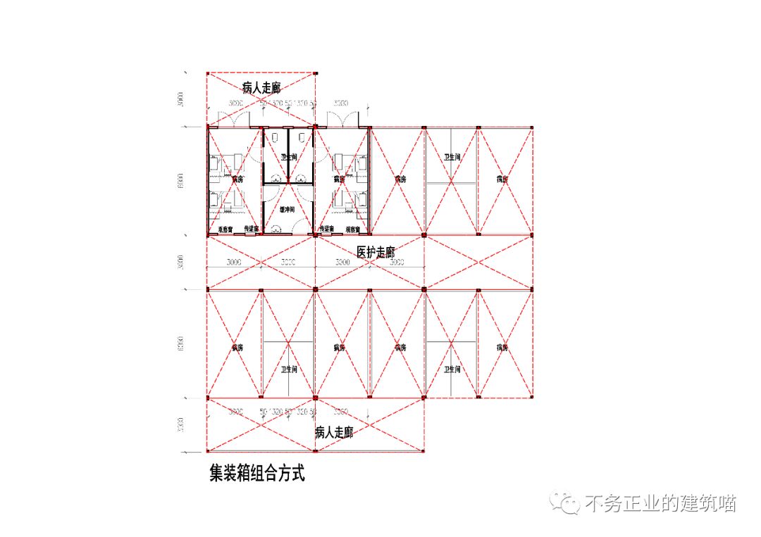 三塊集裝箱板拼成兩個病房,走廊的集裝箱板與病房的垂直。
