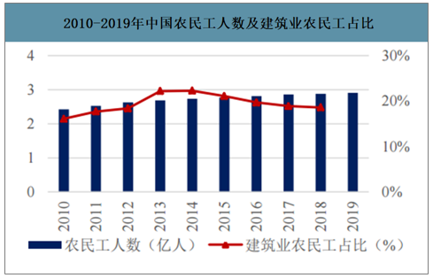 2010-2019年中國農民工人數及建筑業農民工占比