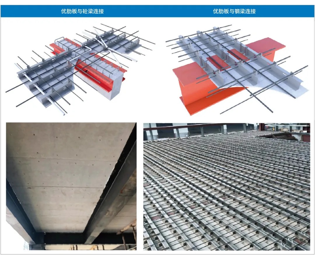 優肋板是歐本研發的新型疊合樓層板,采用冷彎薄壁型鋼加工成肋、通過螺釘與底部的纖維水泥板結合;肋上連續沖孔,板內可以穿鋼筋和管線;纖維水泥底板在澆筑混凝土時作為模板,只需少量支撐即可,完成后無需拆除,對結構來說是保護層,對建筑來說是裝飾層。其構造簡潔易于施工,非常符合裝配式建筑發展的要求,在成本控制、工廠生產及現場安裝節點處理上都具有明顯優勢,具有廣闊的市場潛力。