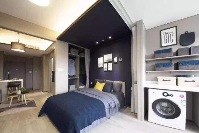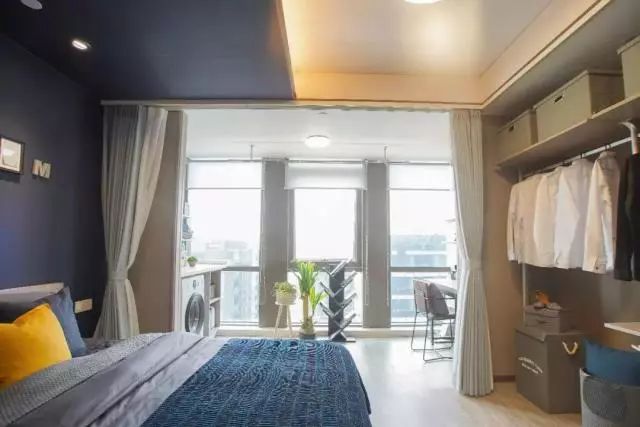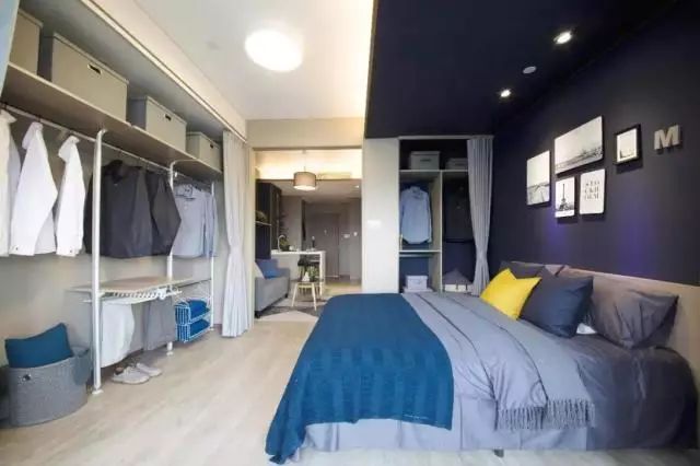 36㎡戶型的臥室空間,吊頂的雙層拼接和頂面到墻面的同色銜接是一大亮點。我們可以看到頂面有兩個體系,高頂的白色部分是軟膜,質感和視覺效果和傳統的乳膠漆沒有區別,并且這個膜具有很強的張力,可以在上面開洞,安裝燈、噴淋口燈設備,這就是品宅的軟膜天花吊頂體系。旁邊深藍色的低頂,是仿乳膠漆效果的膜,采用了與墻面同色的膜材覆在竹木纖維板上,通過裝配式吊頂體系獨有的配件,固定在龍骨上,整個板沒有刷漆等過程,安全、環保、快速,同時可以實現從頂到地的完美搭配。