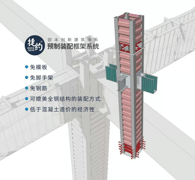 為了方面記憶,它有個有趣的名字“甲殼柱”、“甲殼梁”,鋼甲殼,代替了配筋,代替了模板,甲殼柱+甲殼梁+優弦梁 + 優肋板 = “捷約”預制框架系統。