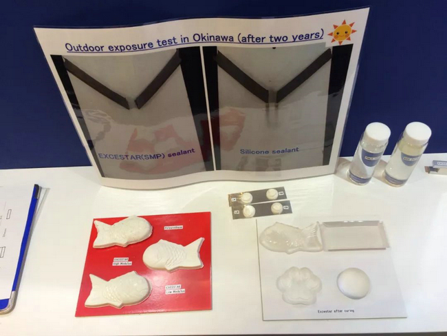 一款名為EXCESTAR的硅烷改性聚醚產品,這款產品是AGC獨有的高分子化學技術研發的,以超高分子量聚醚為主鏈、甲氧硅基封端的新型高分子液態聚合物,加入催化劑后常溫狀態下會與空氣中的水反應形成彈性體。作為一種用于生產密封膠、膠粘劑等產品的樹脂原料,在多樣化的領域被廣泛應用。